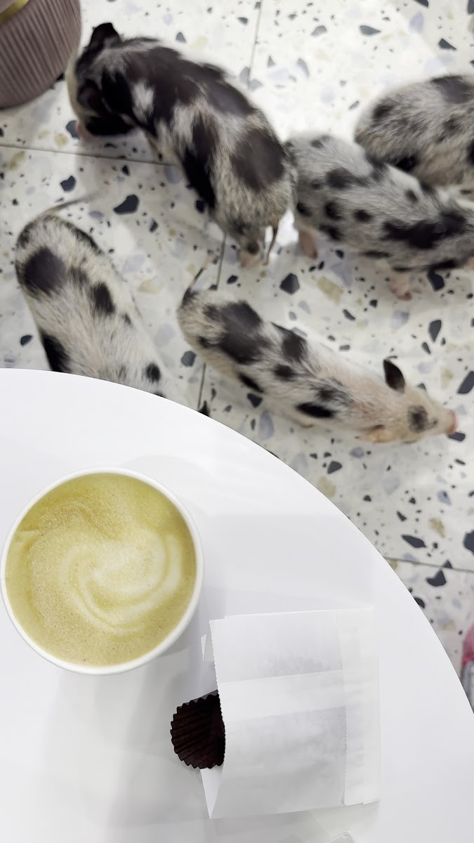 The space is thoughtfully divided to accommodate different visitor moods: one area invites you to quietly sip coffee and enjoy sweets without interruption, while a separate animal zone lets guests interact with the pigs, who are clean, well-cared-for, and surprisingly sociable — many visitors mention how the piglets are happy to be petted and are quite the characters.